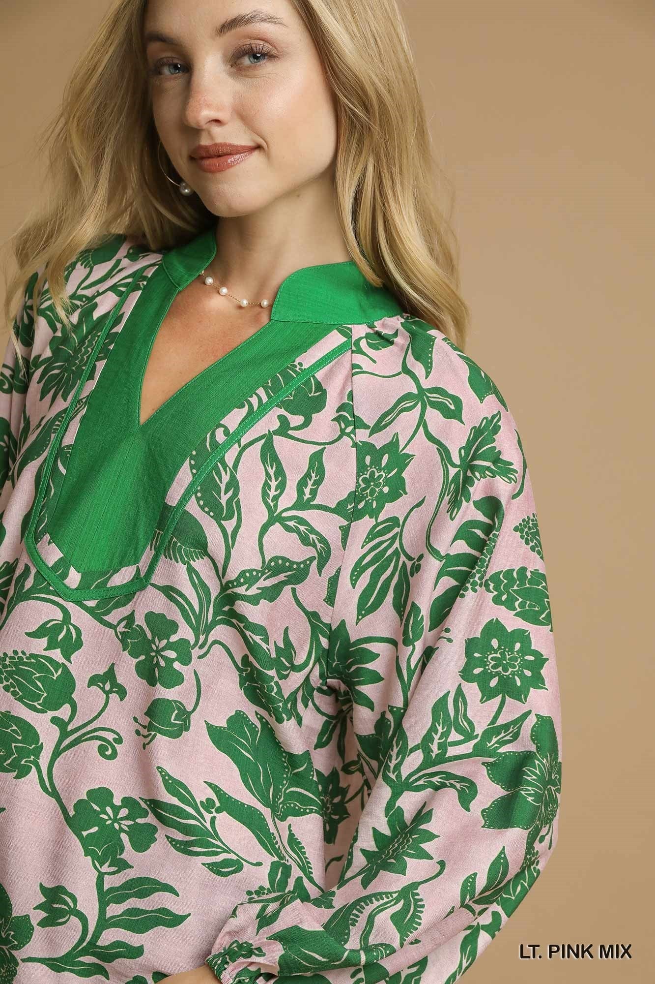 Discover the perfect blend of style and comfort with the Umgee - Top - Floral Print Top - Pink Green. This stunning two-tone blouse features a deep V-neckline and long balloon sleeves that create a relaxed, flowy silhouette, making it ideal for any occasion. The slight high-low hem adds a touch of modern flair, while the contrast placket enhances its unique design. Crafted from a soft fabric blend of 55% cotton and 45% rayon, this top is not lined, ensuring a lightweight feel for all-day wear. Pair it with your favorite jeans or a skirt for a chic look that stands out.