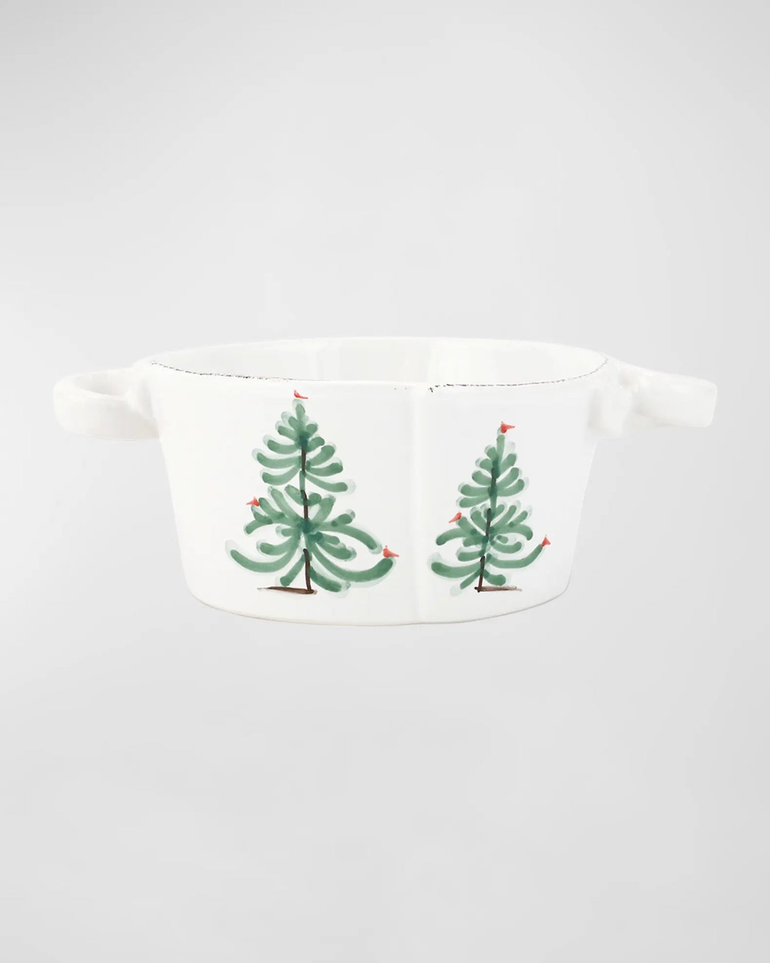 Delight in the holiday magic as handpainted fir trees and bright cardinals drift across the fresh white canvas of the Lastra Holiday Small Handled Bowl. Mix and match with Lastra for a fun and sophisticated holiday table with a twist!