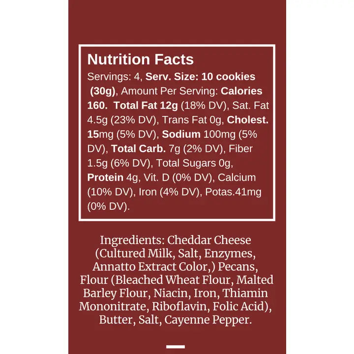 Watanut - Cheddar Cocktail Cookie Tube is a delightful treat crafted from all-natural extra sharp New York cheddar, real butter, and fresh Georgia pecans. This crisp and savory cookie delivers a bold cheddar flavor with a subtle hint of cayenne, making it an ideal choice for parties or casual snacking at any time. The new larger size, measuring 4 inches in diameter and 5 inches tall, ensures you have plenty to share—or to enjoy all on your own. Perfect for cheese lovers and snack enthusiasts alike, the Watanut - Cheddar Cocktail Cookie Tube is a must-have addition to your pantry.