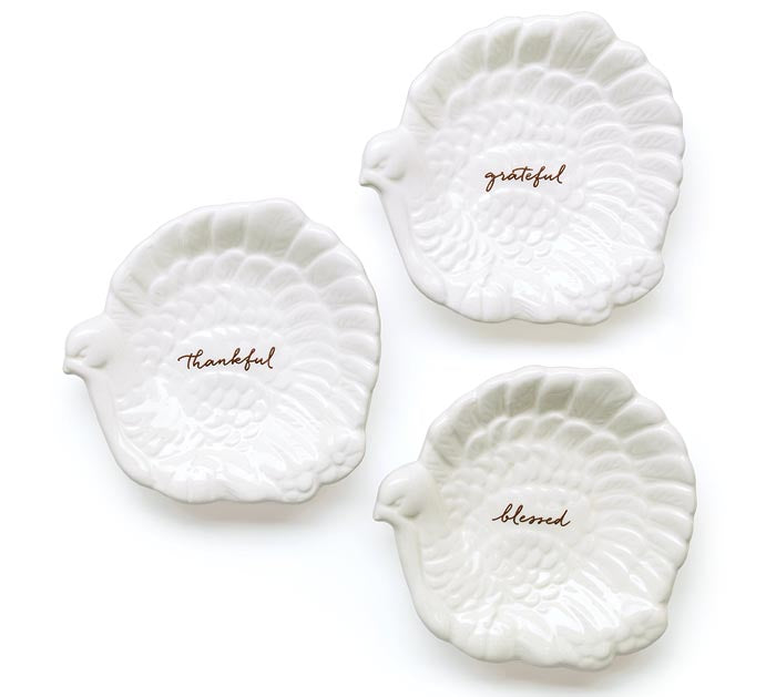 Each plate features different words in the center, elegantly adorned with chocolate brown decals spelling out "Thankful," "Grateful," and "Blessed." These charming plates add a touch of sophistication to your holiday table setting.